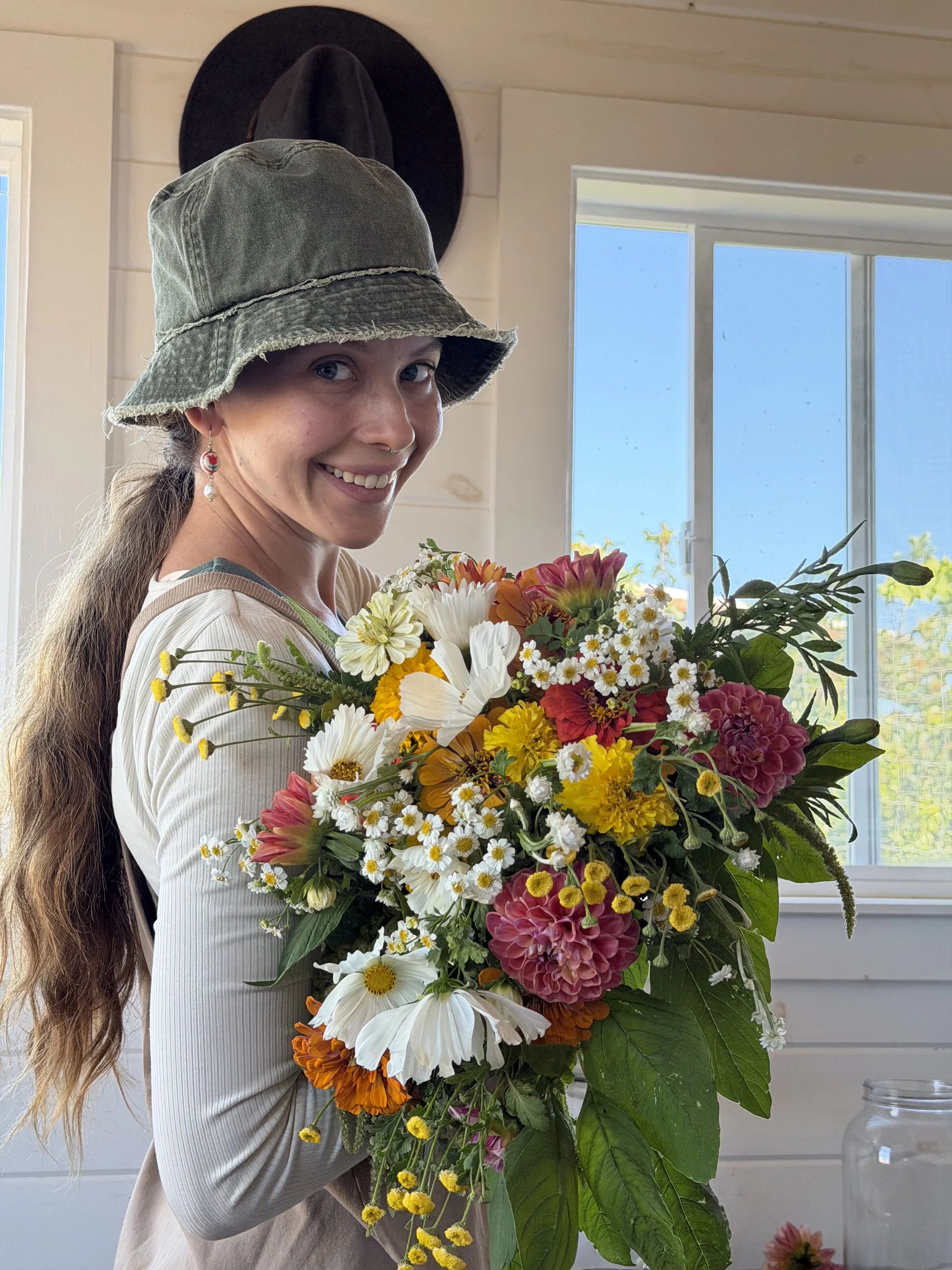 Blooms include annual cut flowers, dahlias, perennials, & native wildflowers. Our favorites are feverfew, yarrow, celosia, scabiosa, cosmos, zinnias, stock, snapdragons, & more. Weekly pick-up at City Farm SLO on Wednesdays or an alternative location [Lumin Earth Apothecary in Morro Bay] on Fridays.